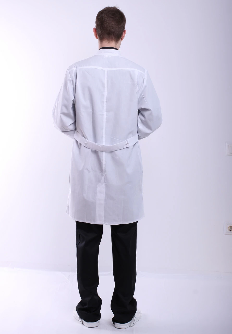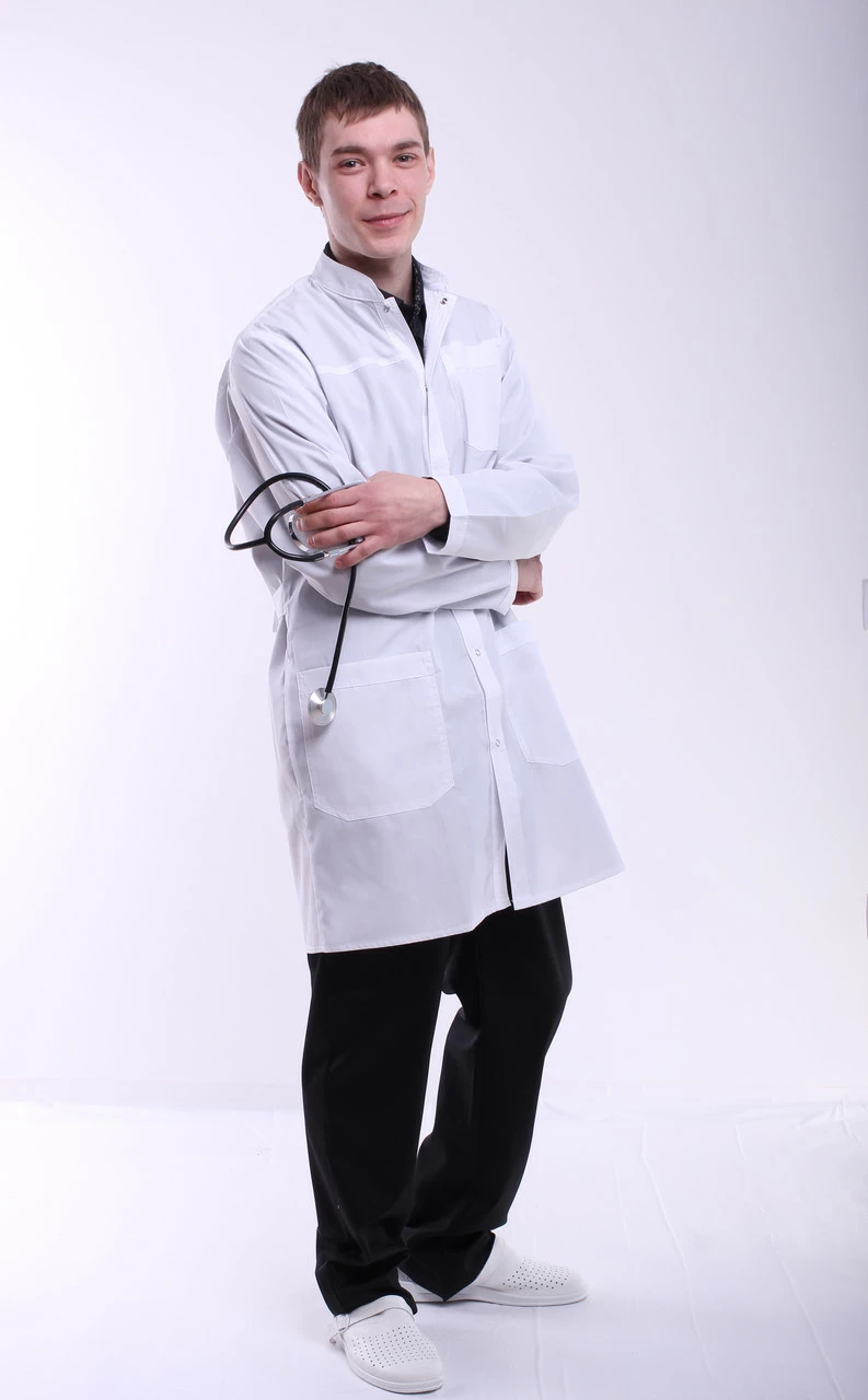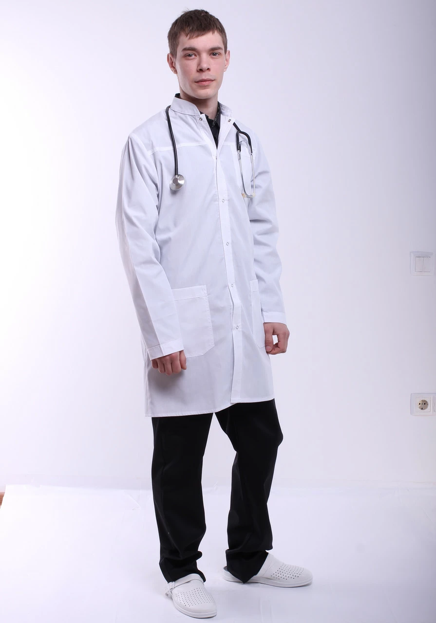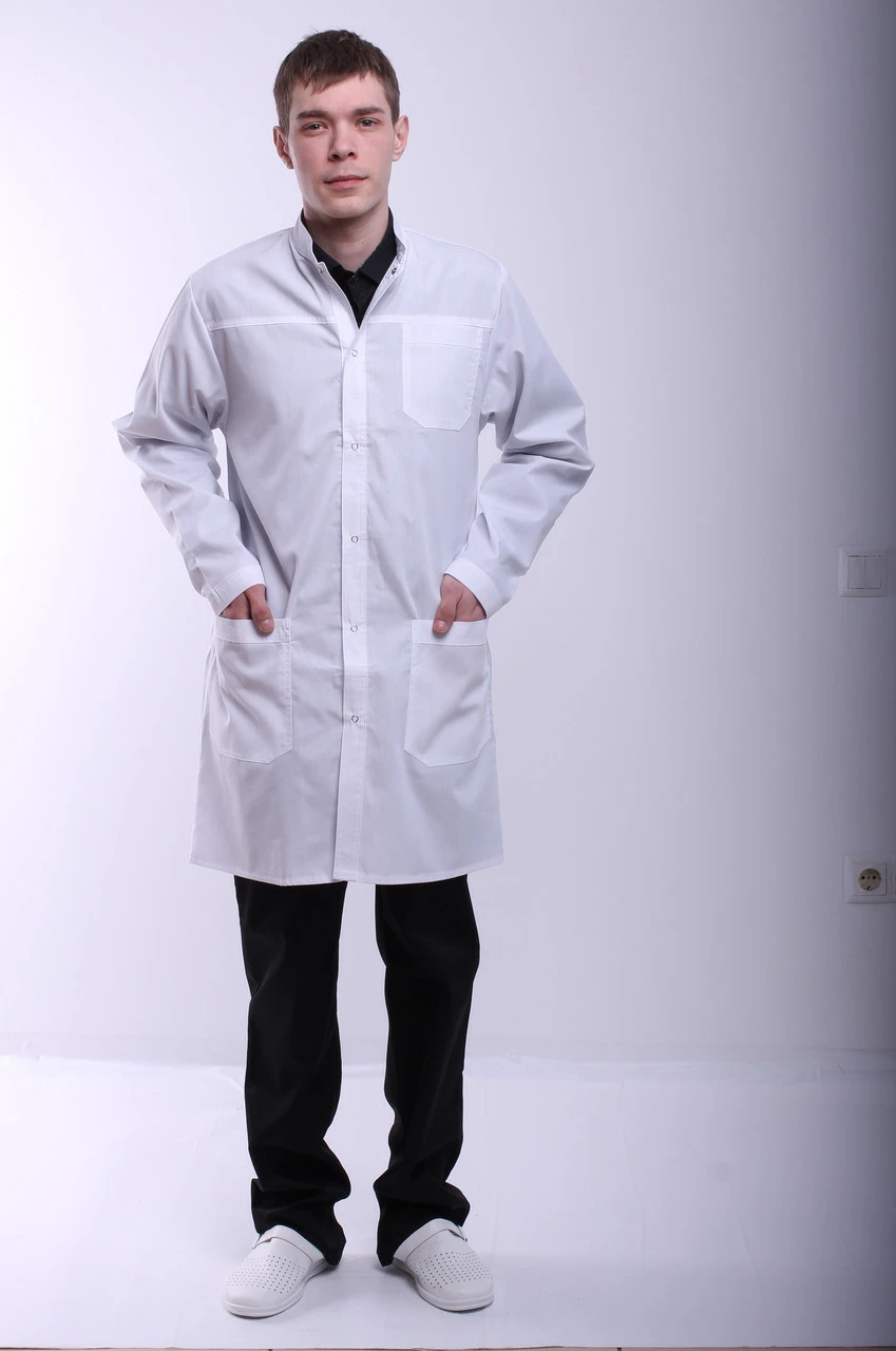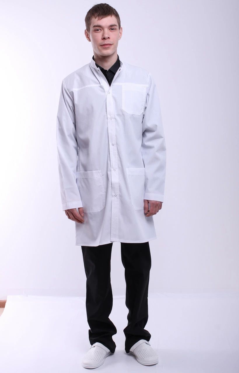 - Халат имеет три кармана: два накладные внизу и один маленький нагрудный.