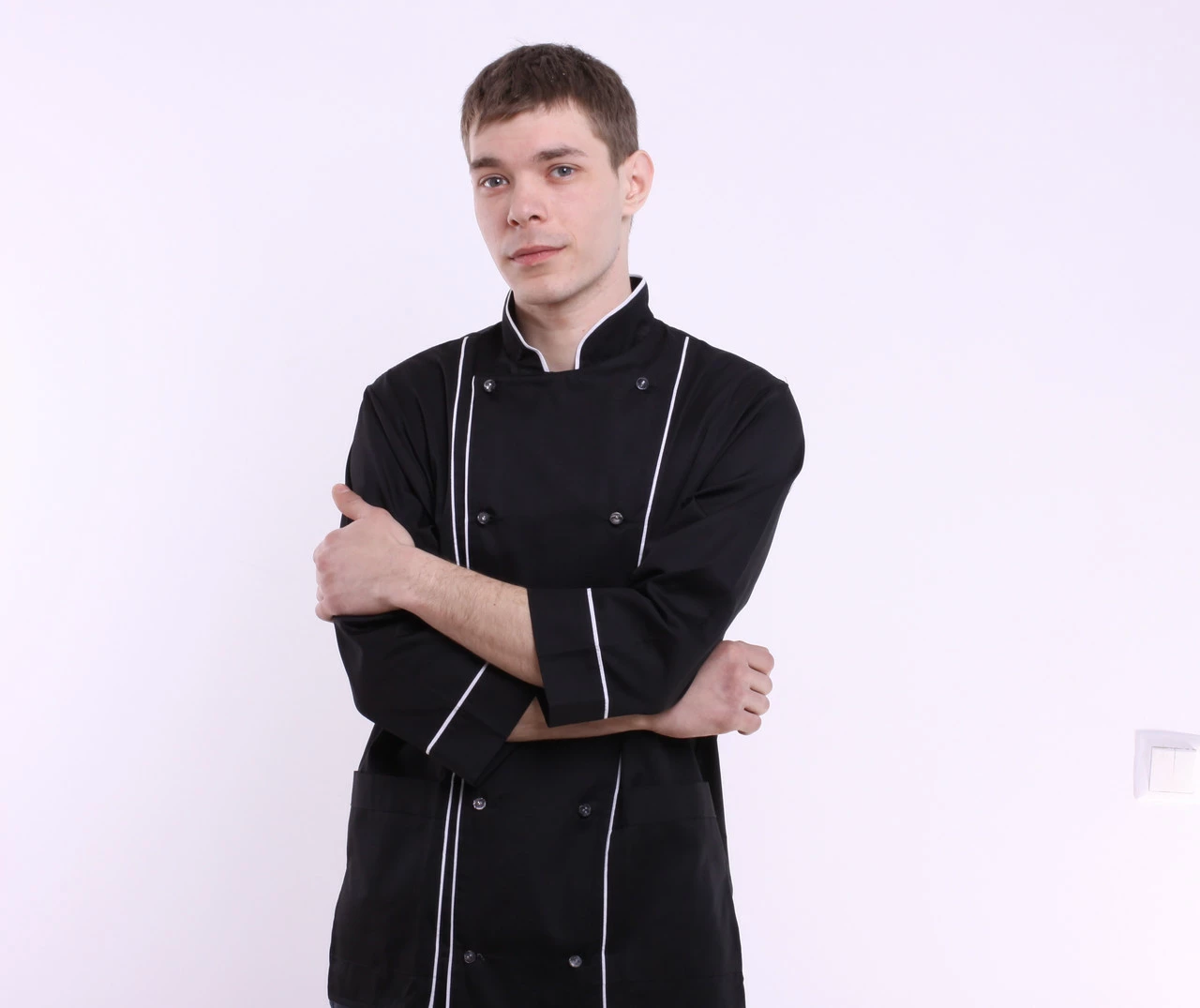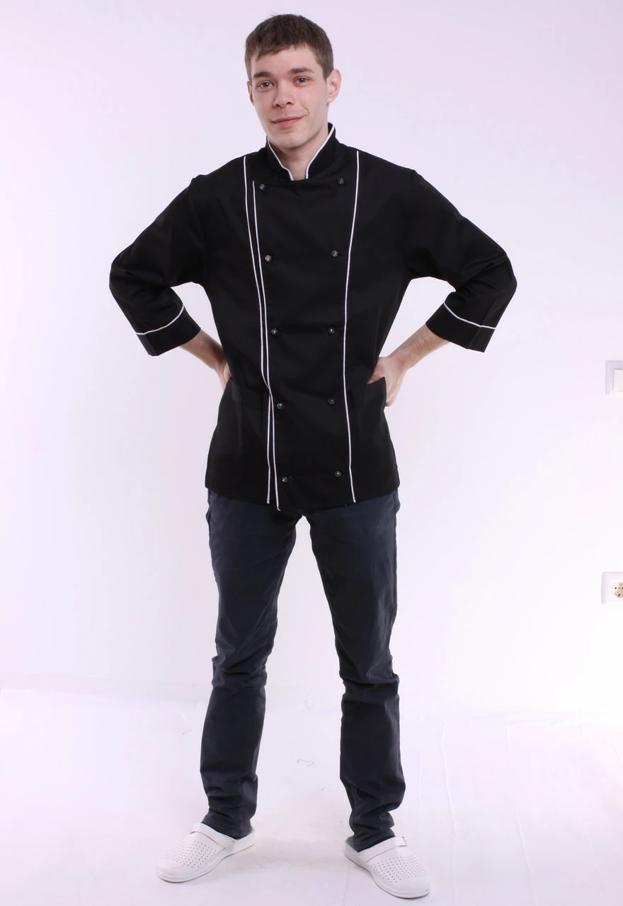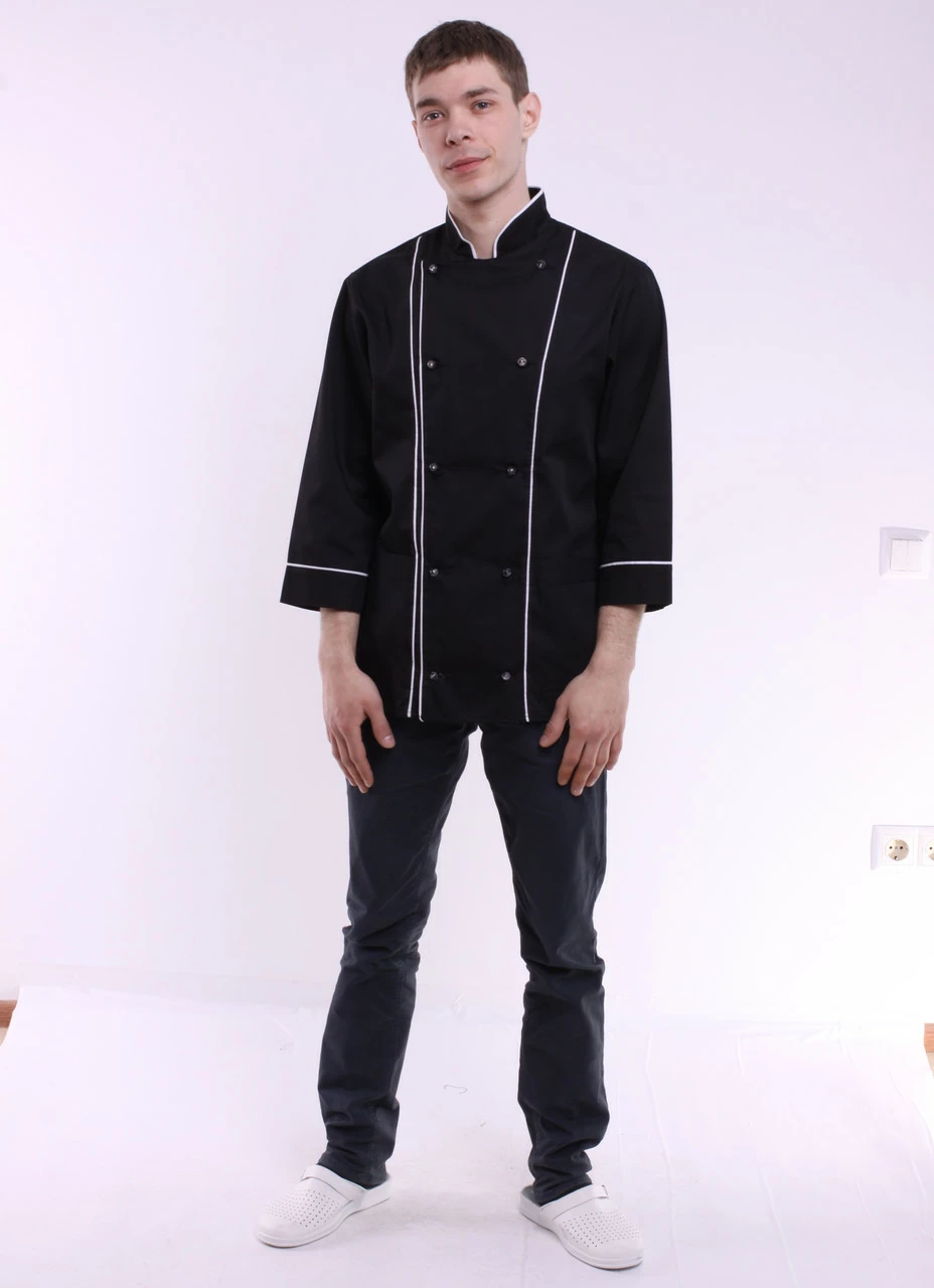 Китель двубортный черный с белой окантовкой Застегивается на две стороны (пуговицы- пукли). Легкий, летний вариант для работы на кухне с длиной рукава 3/4.Плотность ткани 115гр./м2. Ткань мягкая и приятная к телу- уникальное плетение дает хорошую плотность но не делает ткань грубой. Благодаря плотной основе выдерживает многократную стирку. Хорошо пропускает воздух и влагу