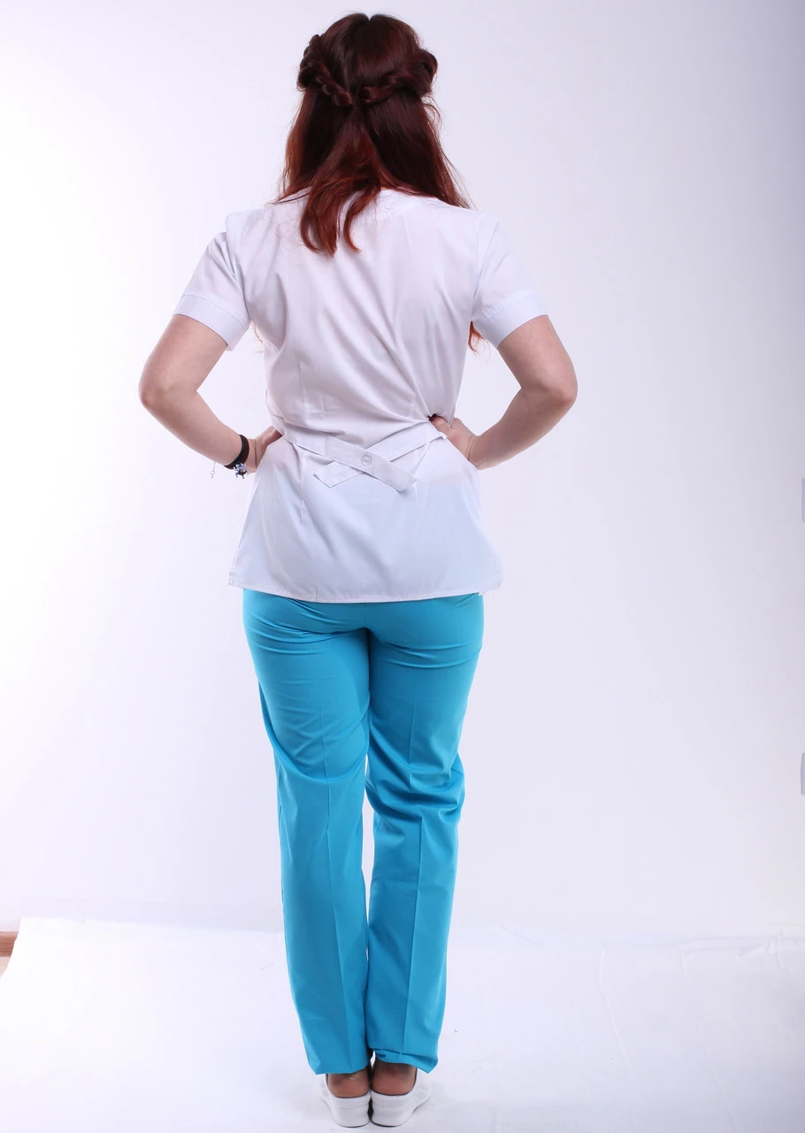 Стильная медицинская блузка белого цвета, имеет воротничок декоративного кроя, удобный короткий рукав, две практические накладные карманы и застегивается на пуговицы. Является одной из самых популярных моделей, хорошо выглядит в комплекте с брюками как белого, так и других цветов. А благодаря широкой размерной сетке блузку можно подобрать на любой тип фигуры.